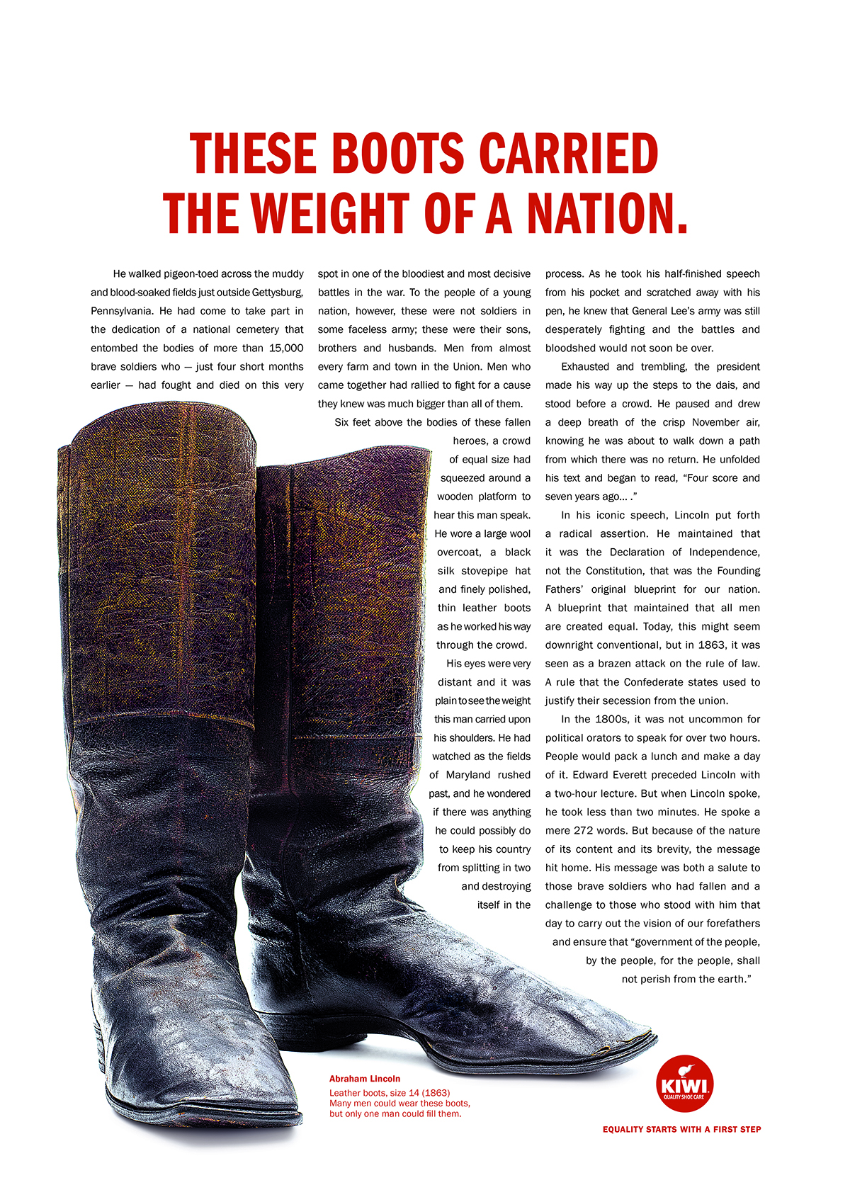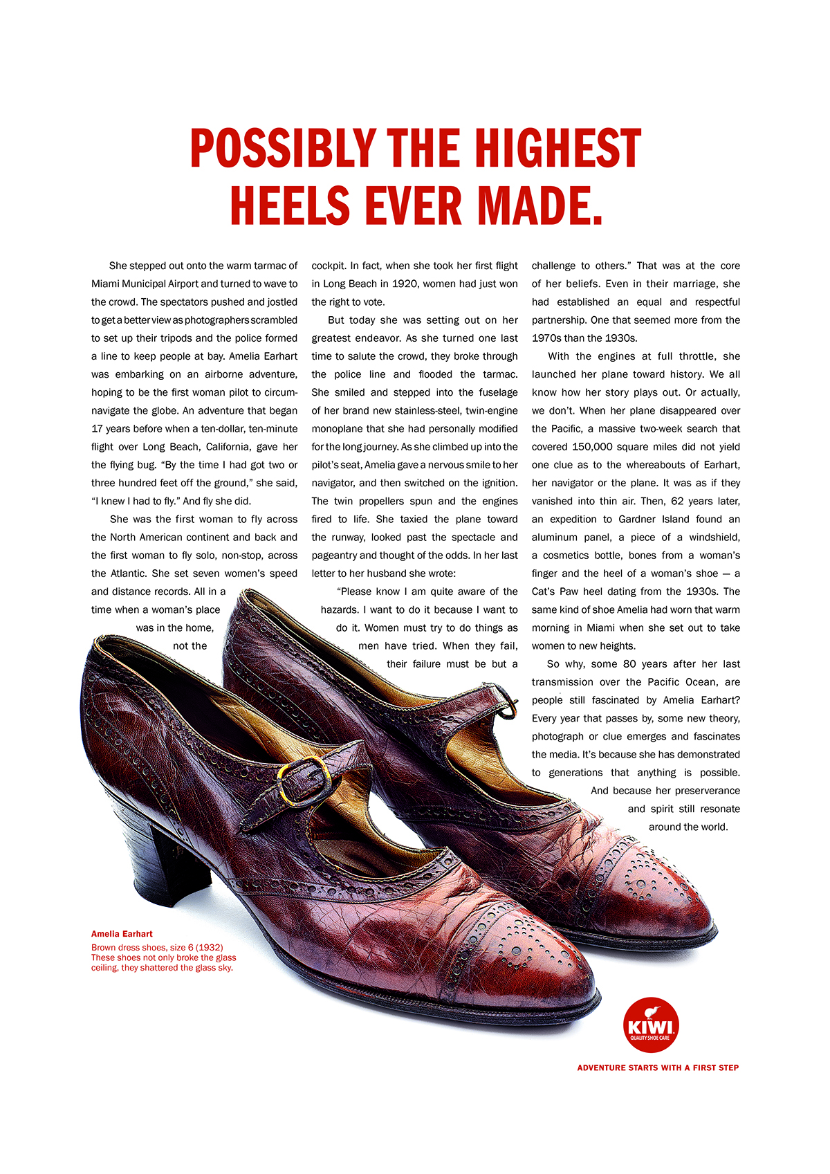 Ogni pubblicità mostra la calzatura originale con una sua storia dettagliata; un piacere da leggere!
