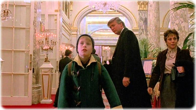 In Mamma ho riperso l’aereo: mi sono smarrito a New York (1992) troviamo una scena con Donald Trump. Il motivo è molto semplice: Donald Trump dava il permesso di girare le scene negli edifici che possedeva (il Plaza Hotel all’epoca), solo se il regista scriveva appositamente per lui una parte nel film in questione.