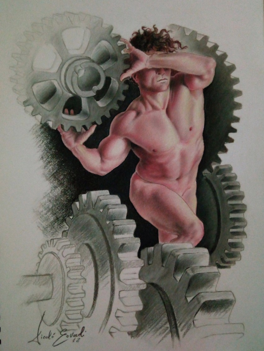 Quest’opera è un omaggio alla “Volontà Risolutrice” e un invito alla ricerca della propria libertà. Pastelli su carta ruvida, 26x34 cm. La scena è onirica: l’uomo è stretto nella morsa soffocante di molti ingranaggi che rappresentano i tanti meccanismi sociali, naturali e/o artistici all’interno dei quali la società sembra imbrigliarlo. L’uomo ritratto però non lascia soffocarsi e, forte della propria consapevolezza, infrage questi equilibri dando un nuovo ordine alle cose, un nuovo ordine a questi meccanismi, passando da oppresso a libero e da comparsa a protagonista della propria vita.