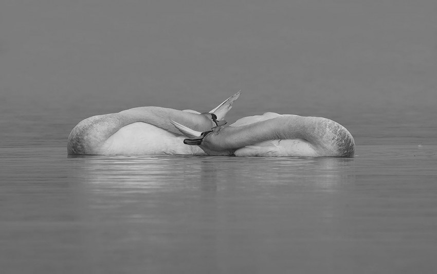 Una coppia di cigni reali in amore si scambiano effusioni in uno specchio di laguna.