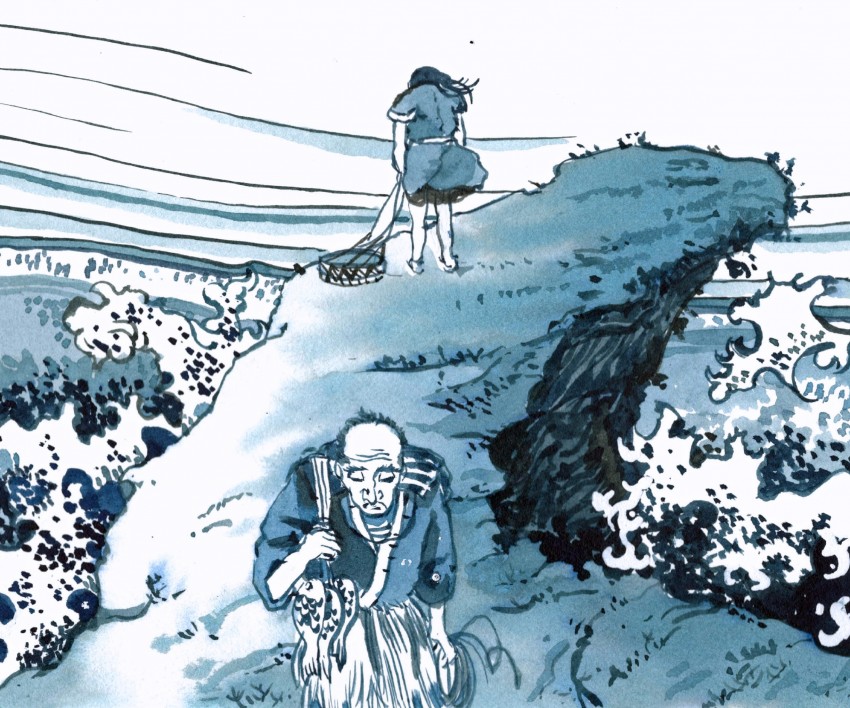 L'idea di questa illustrazione è immaginare la vita che scorre oltre i dipinti rappresentati da Hokusai. Viaggiare e interrogarsi, trovare nuove forme e sensazioni che ti suscitano un'opera d'arte.