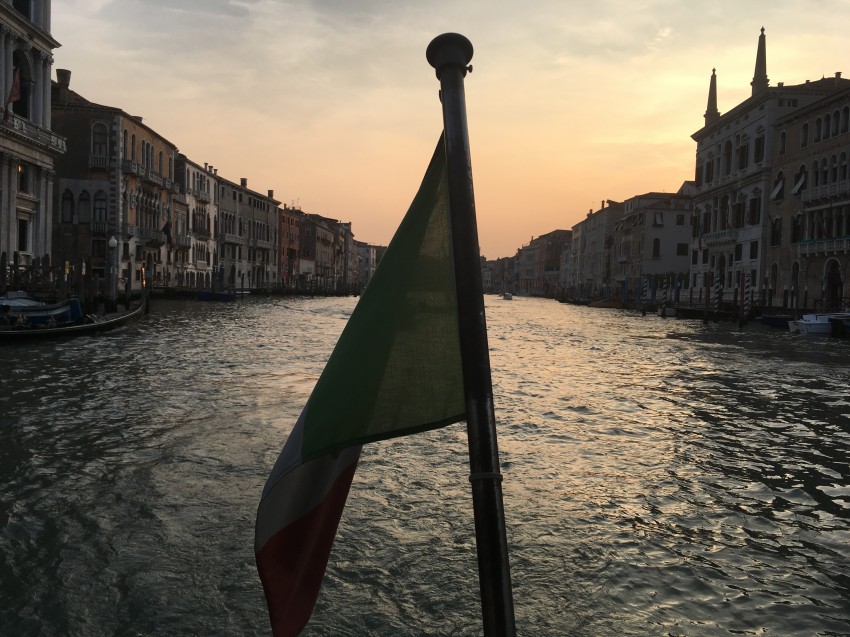 Bandiera italiana volando sul Gran Canale di Venezia al tramonto