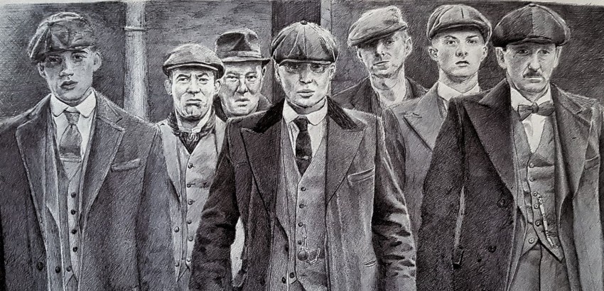 Disegno in formato A4, fatto con penna bic nera Rappresentazione di una scena della serie tv "Peaky Blinders" Ore di lavoro: 36 h