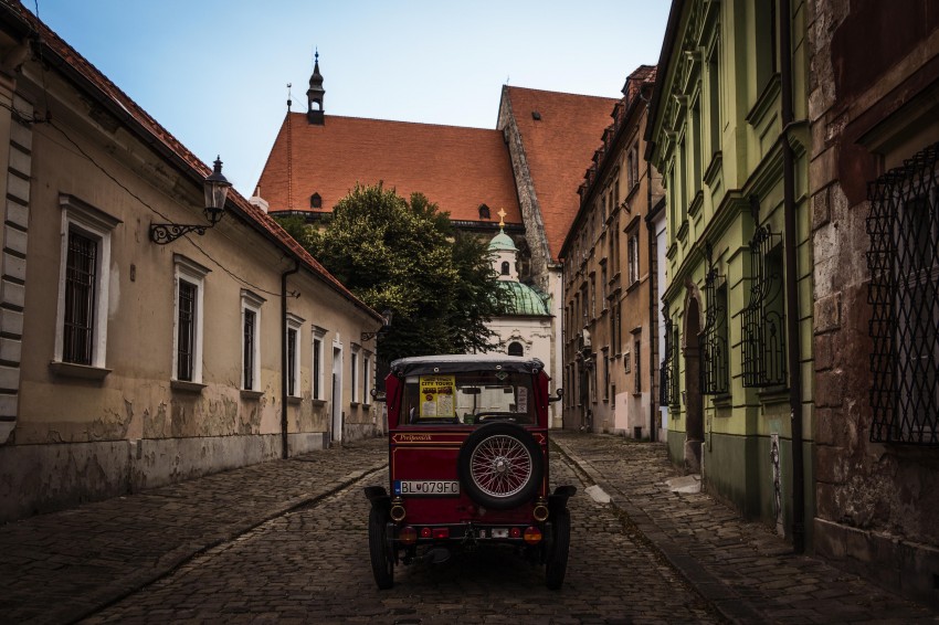 Caratteristica vettura d'epoca tra i vicoli storici del centro di Bratislava