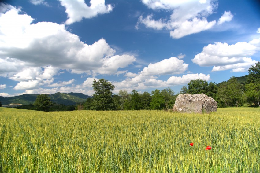 Un bellissimo prato estivo in fiore su uno sfondo di cielo nuvoloso e una pietra solitaria abbandonata.