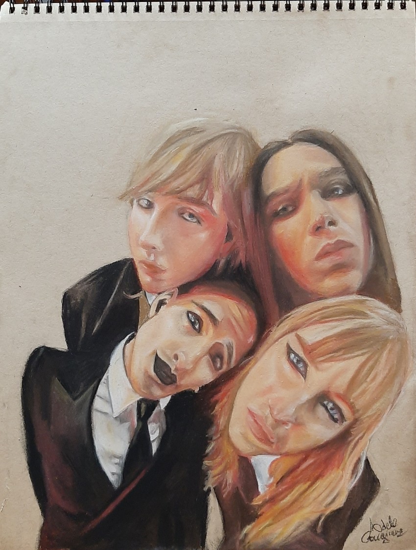 Ritratto della rock band vincitrice di Sanremo 2021, estratto dal video musicale "Zitti e buoni". Realizzato con matite pastello Caran D'ache e Carbothello su carta marrone.