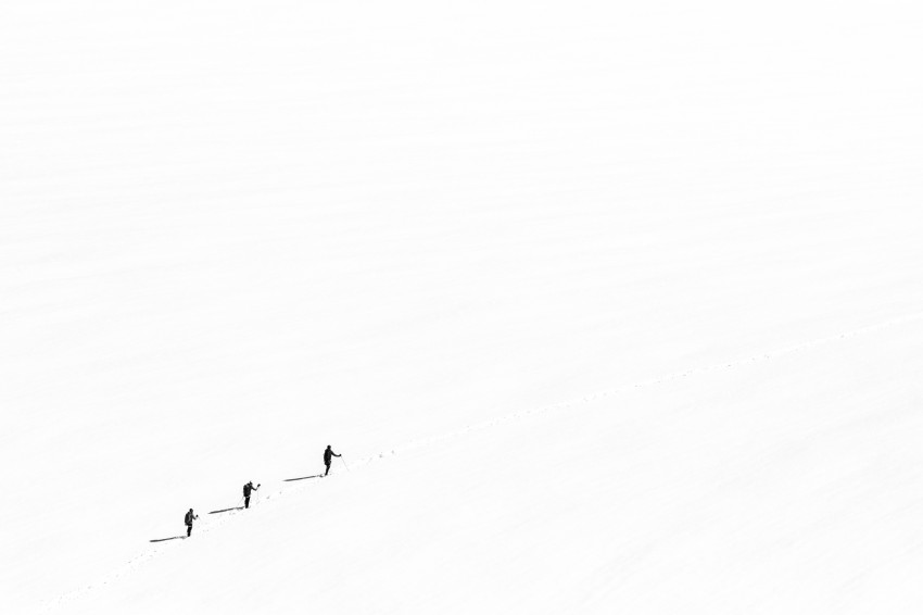 Una foto minimal cercata e realizzata. Ci troviamo sul ghiacciaio del Monte Bianco e qui possono accedervi solamente alpinisti esperti attrezzati o affiancati da una guida alpina locale.