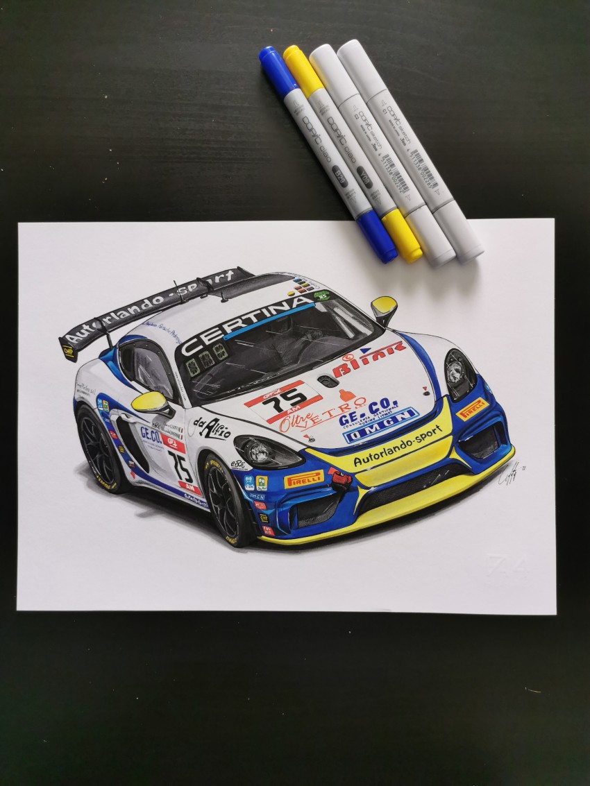 Illustrazione di una Porsche Cayman GT4 partecipante ad un campionato italiano di automobilismo. Realizzata con pantoni e matite