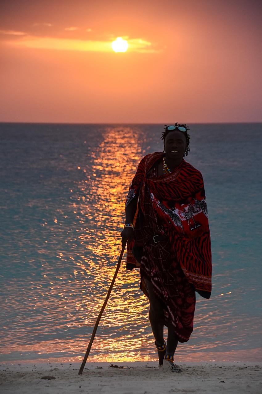 Un Masai, membro di una popolazione della Tanzania, che passeggia al tramonto