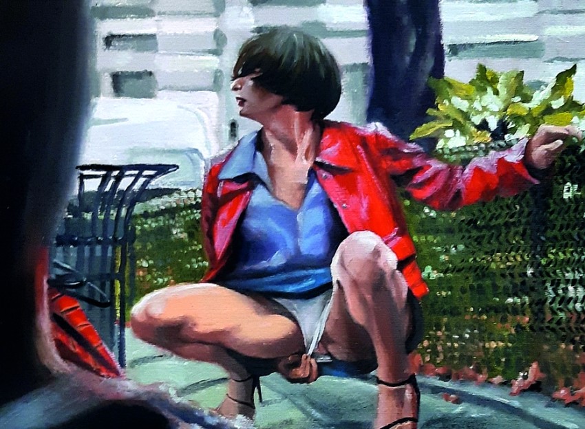 Roy Steward, fotografo statunitense, glamour e pornografico. Ho voluto omaggiarlo seguendo il suo stile fine anni '90, un viaggio nelle capitali europee, alla "ricerca" di donne nascoste, assorte, libere. Un opera su carta 30x40 dipinta ad olio, un'immagine, un fotogramma, uno sbirciare curioso, sensuale... Il soggetto è esplicito, una sagoma sfocata, ci da l'idea di un osservatore. Un voyeurismo esplicito non più attraverso il buco della serratura e in camere private. Qui è tutto allo scoperto. In città di giorno.