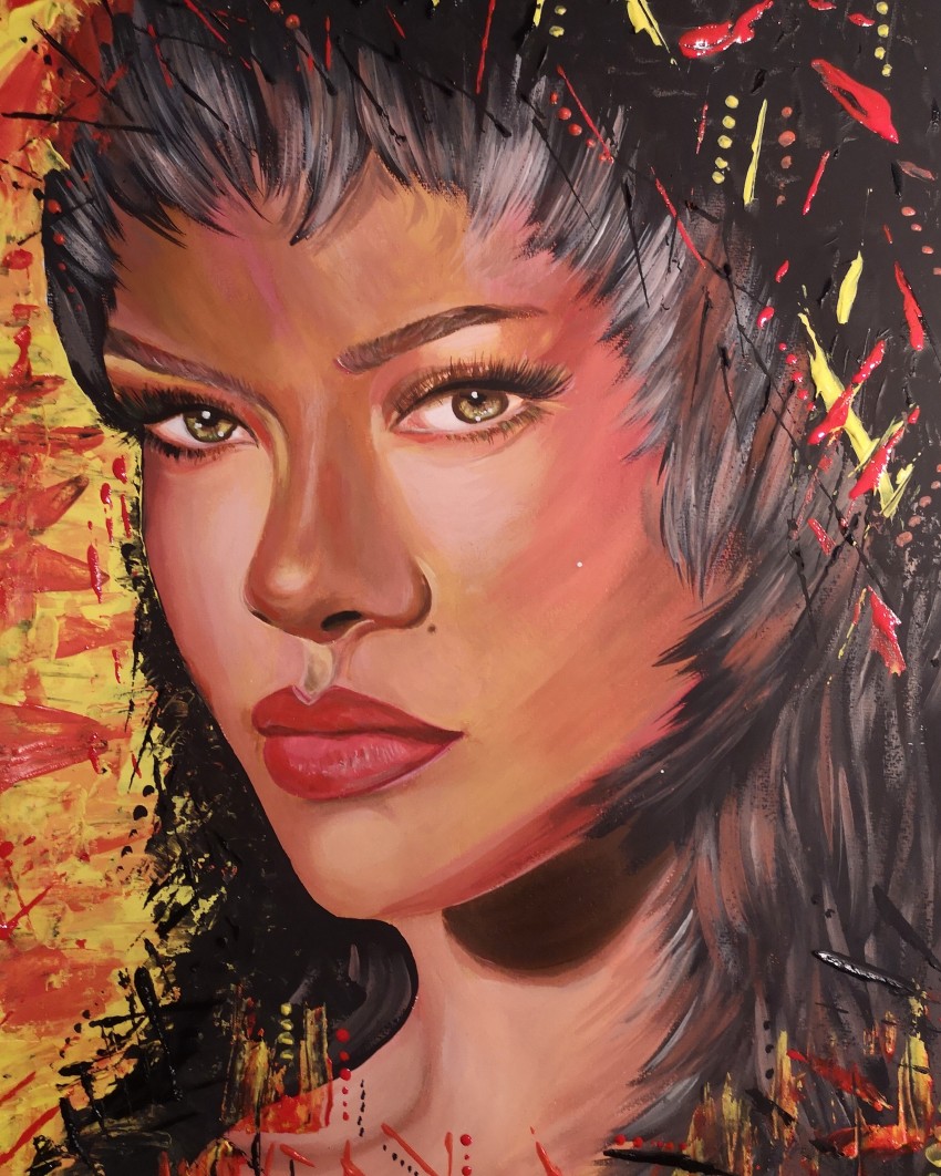 Ritratto di Rihanna. Colori acrilici su cartoncino.