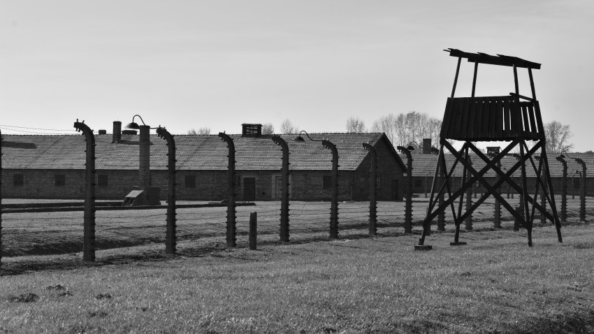Fotografia scattata presso il campo di concentramento di Auschwitz-Birkenau. Nel dettaglio i casolari dove dormivano i deportati, il recinto col filo spinato e la torre sentinella delle guardie.