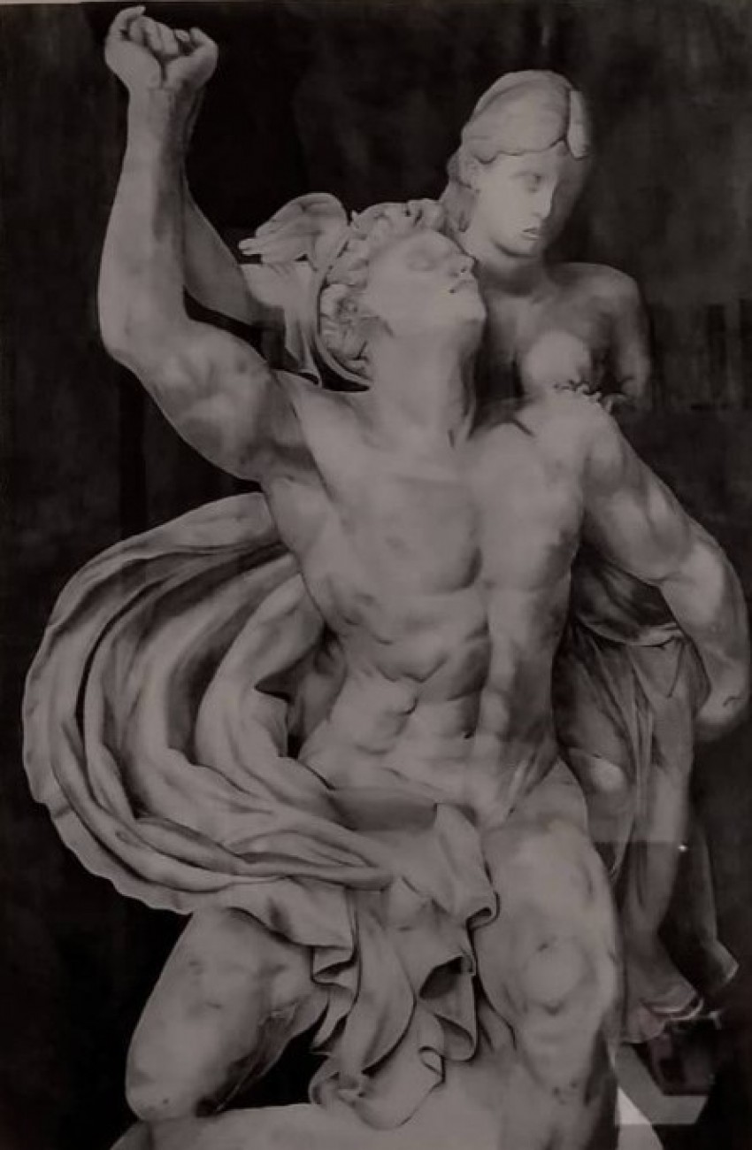 Rappresentazione della statua "Mercurio e Psiche" di Reinhold Begas, matita su carta.