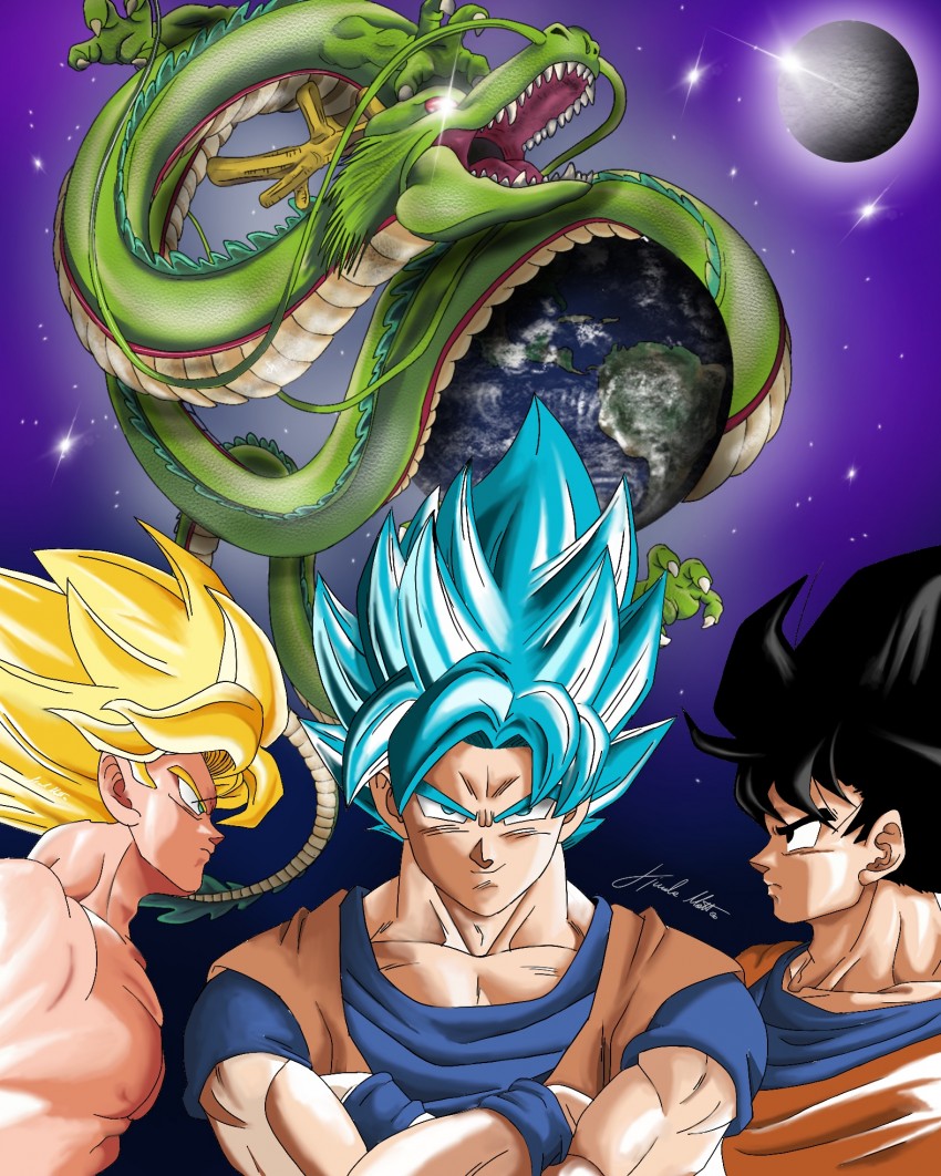 Illustrazione grafica raffigurante il manga più famoso di tutti i tempi Dragon Ball. Le principali trasformazioni per ogni saga, Dragon Ball , Dragon Ball Z , Dragon Ball Super = ZUPER. Illustrazione unica no copia.