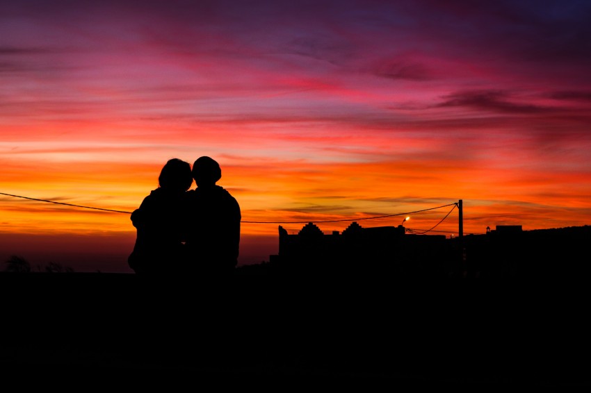 tramonto mozzafiato, marocchino, con due innamorati che si abbracciano rivolti verso l'orizzonte