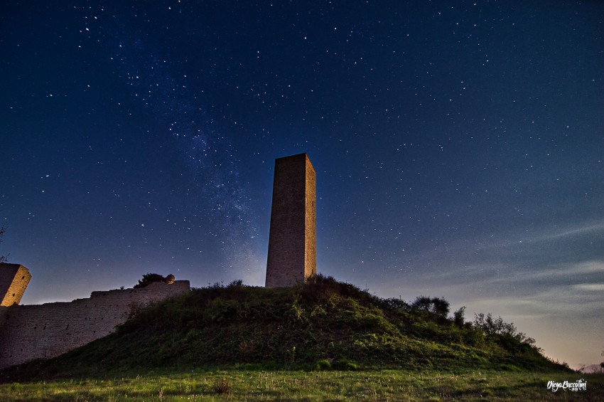 Castello di Pitino, a San Severino Marche (MC) in uno scatto notturno, con il cielo stellato e la Via Lattea sullo sfondo.