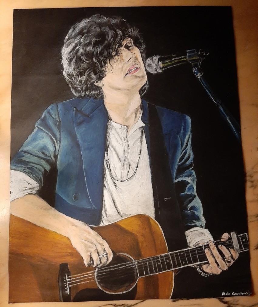 Ritratto con Pastelli ad olio su cartoncino nero 50x65. Rappresentazione del rapporto tra un uomo e la sua musica, intimo, intenso, vibrante ed indescrivibile.