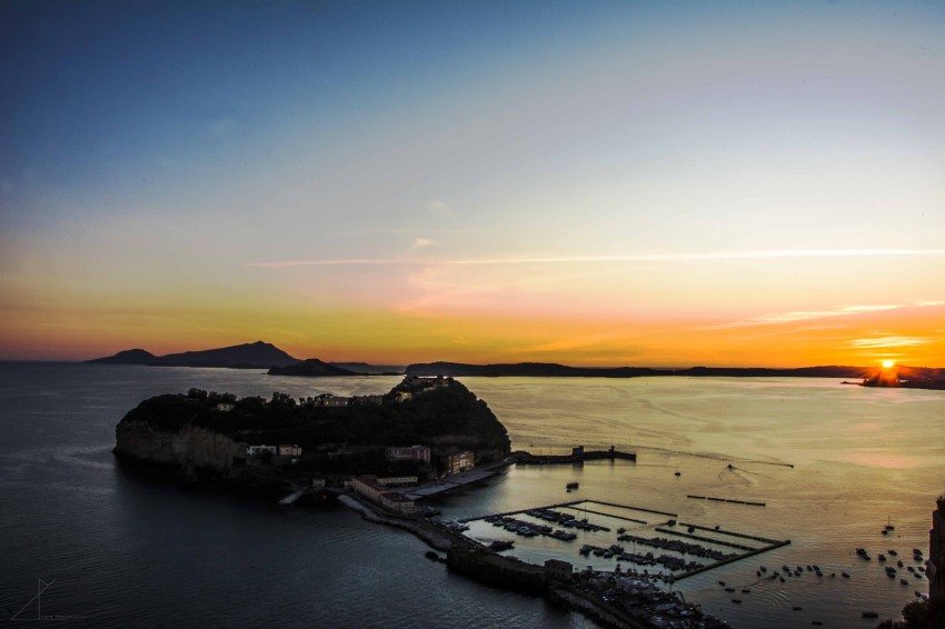 Un panorama dall'alto del parco Virgiliano verso Nisida, l'isola-carcere, e la costa occidentale del golfo di Napoli.