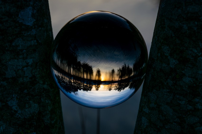 Scatto di un tramonto su un laghetto in campagna, visto attraverso una Lensball.