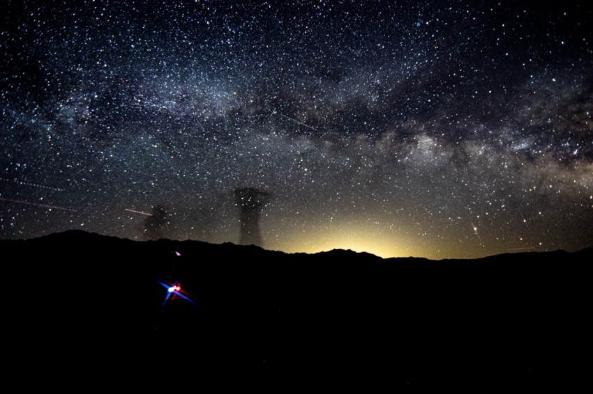 I shot this picture in Death Valley National Park. My friends and I waited for the Milky Way to rise at the famouse Zabriskie Point. It was wuite hot, despite the late hour. I waited for the Milky Way to arch on top of the light pollution coming from Las Vegas, more or less 100miles away, and I shot. I like the contrast between artificial light pollution and the beauty of the natural light of the Milky Way.