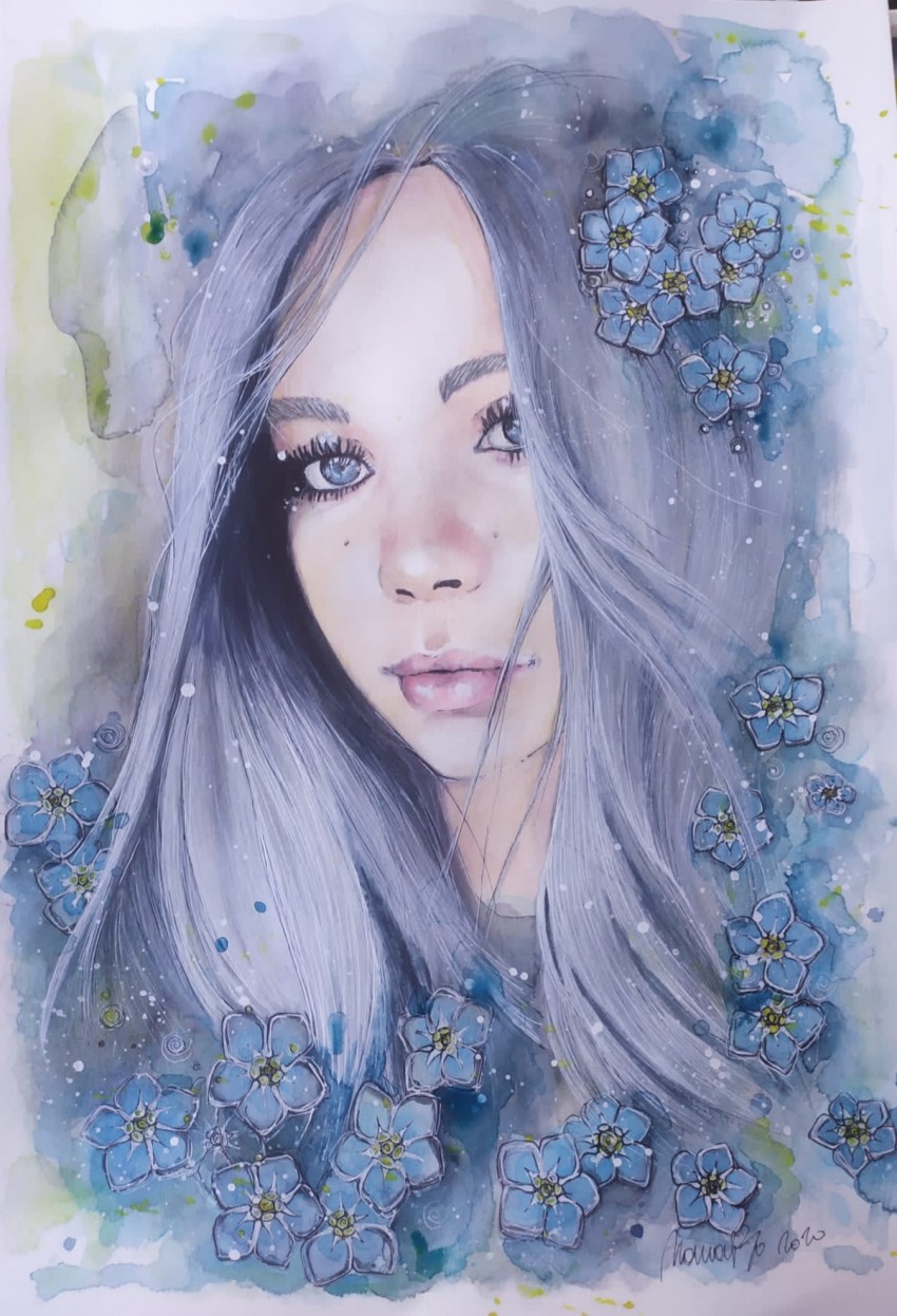 Ritratto ad acquerello, acrilico e penna su carta 300 gr.; cm 29,7 x 42
